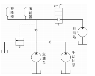 圖為柴油機的油馬達啟動系統(tǒng),在該系統(tǒng)中設置有蓄能器。啟動時,扳動二位二通手動換向閥,蓄能器供油驅(qū)動馬達去帶動柴油機啟動。柴油機啟動后松開手動換向閥,截止通向馬達的回路,油泵向蓄能器充油,以備再用。圖中手動油泵是在蓄能器漏泄后補油用。