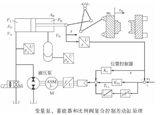 采用伺服泵或變速泵,不經(jīng)節(jié)流元件,直接控制差動液壓缸的運動,是液壓控制技術(shù)領(lǐng)域?qū)崿F(xiàn)節(jié)能、減小系統(tǒng)發(fā)熱的有效途徑之一,也是目前國內(nèi)外的研究熱點。發(fā)展優(yōu)化的回路原理,在滿足系統(tǒng)動靜態(tài)特性要求的同時,使能耗降低到最小,基于這一思想,針對注塑機(jī)中運動的特點,用單臺變量泵結(jié)合蓄能器和旁通比例閥復(fù)合控制差動缸運動的回路原理,不僅簡化了系統(tǒng),也使鎖模機(jī)構(gòu)每天工作循環(huán)的能耗由原18KW/S降低為11KW/S。