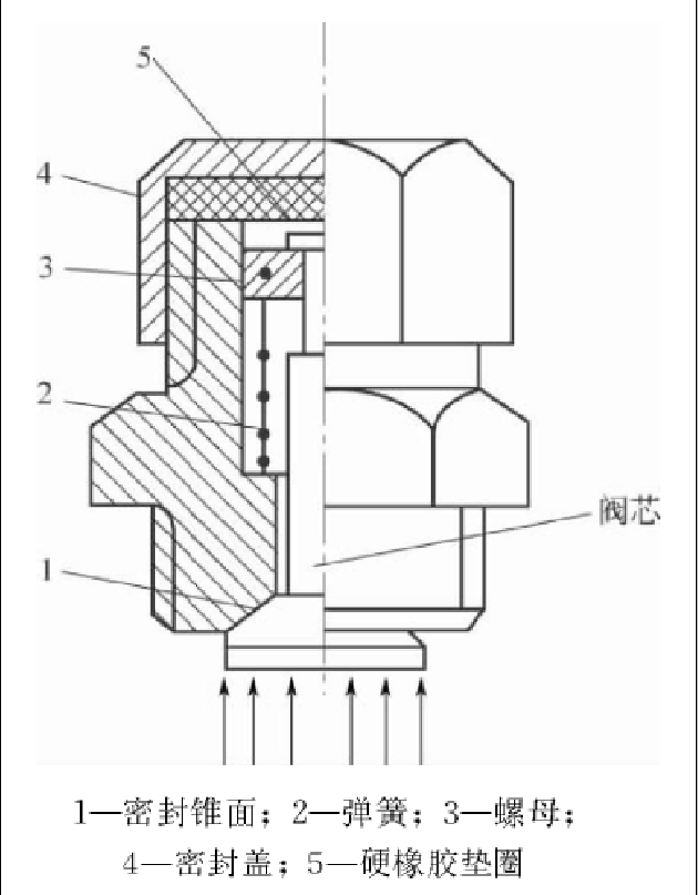 皮囊式蓄能器,皮囊的充氣閥為單向閥的形式,靠密封錐面密封(如圖所示)。當(dāng)蓄能器在工作過程中受到振動(dòng)時(shí),有可能使閥芯松動(dòng),使密封錐面1不密合,導(dǎo)致漏氣。閥芯錐面上拉有溝槽,或者錐面上粘有污物,均可能導(dǎo)致漏氣。此時(shí)可在充氣閥的密封蓋4內(nèi)墊入厚3mm左右的硬橡膠墊圈5,以及采取修磨密封錐面使之密合等措施解決。