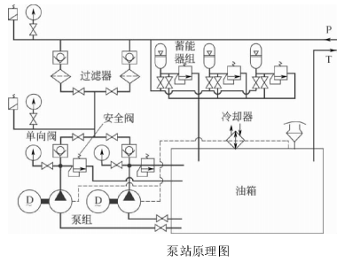 泵站主要由泵組(一用一備),溢流閥,蓄能器,過(guò)濾器,油箱等組成。