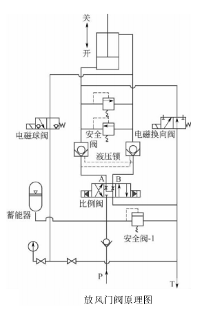 鼓風(fēng)機(jī)組正常工作時(shí),電磁閥,電磁球閥處于封鎖狀態(tài),由比例閥調(diào)整控制閥門位置:當(dāng)發(fā)生故障停機(jī)或發(fā)生逆流時(shí),電磁閥,電磁球閥通油,使放風(fēng)門快速打開(kāi),迅速放風(fēng)。由于放風(fēng)機(jī)距泵站較遠(yuǎn),在現(xiàn)場(chǎng)增設(shè)蓄能器以補(bǔ)償沿程阻力損失,保持壓力恒定,安全閥-1調(diào)定壓力為13.5MPa,以保護(hù)閥組,另外兩個(gè)安全閥主要防止油缸沖擊。