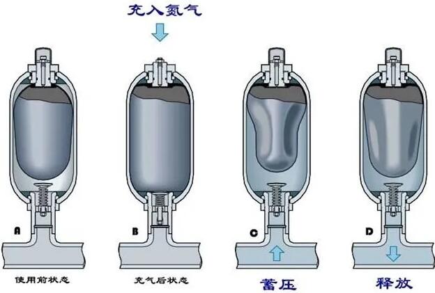蓄能器在其中起保壓和補(bǔ)充系統(tǒng)瞬時(shí)流量的作用。