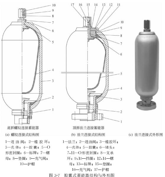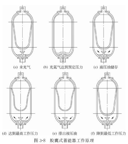 蓄能器由膠囊、殼體(分為氣液兩個腔室)兩部分組成。膠囊內充氮氣,膠囊與殼體組成的腔室充液壓油。當液壓油進入蓄能器殼體時,膠囊內氣體體積隨壓力增加而減少,從而使液壓油儲存起來。若液壓系統(tǒng)需增加液壓油,則蓄能器在氣體膨脹壓力推動下,將液壓油排出給以補充,以達到穩(wěn)壓、補漏的作用。圖3-7所示為膠囊式蓄能器的結構與外形。其工作原理見圖3-8。
