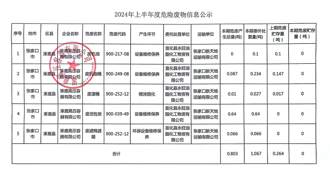 2024年上半年度上期貯存量為0.264噸;本期產(chǎn)生共0.803噸,其中廢機(jī)油桶0.087噸、廢漆桶0.01噸、廢活性炭0.64噸、廢濾棉濾箱0.066噸;截止2024年7月1日剩余貯存量為0噸。